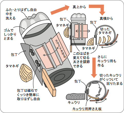 玉ねぎやきゅうりを切るとペットボトルの中に切った玉ねぎやきゅうりがたまっていく。玉ねぎを切るときに出る目を痛くする成分の硫化アリルがペットボトルの中に入るので目が痛くならない。きゅうりは包丁にはりつくので、中にもう1枚押え板をつけ、切るとどんどん上に上がりペットボトルの中に落ちる |