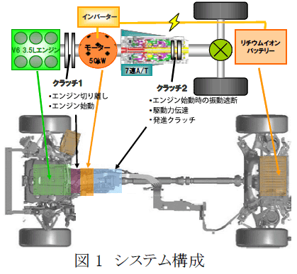 本開発システムの1モーター2クラッチパラレル型は、乗用車用フルハイブリッドシステムとして最も軽量シンプルかつ燃費特性に優れ、特に大排気量エンジンとの組合せでその改善度は顕著である。更に効率を高める為、標準的な発進要素であるトルクコンバーターを廃止した乗用車世界初のシステムである(図1)。本システムは走行中のエンジン停止・始動、変速、発進をクラッチを介して頻繁に切り替えるため、従来技術ではスムースさを実現することが難しく、一般に商品化は困難と認識されてきた。本システムでは、モーターおよびクラッチ制御技術、ハイブリッド車向け高出力・高応答リチウムイオンバッテリーなど多岐に渡る独自技術開発で解決し、高速まで可能なモーター走行、3.5Lエンジンの高級車にも拘らず1.5Lクラス並み19km/Lの燃費性能と気持ちの良いドライビングフィールを実現した。また、 極めて高いEV(モーター)走行頻度も実現した(図2)。