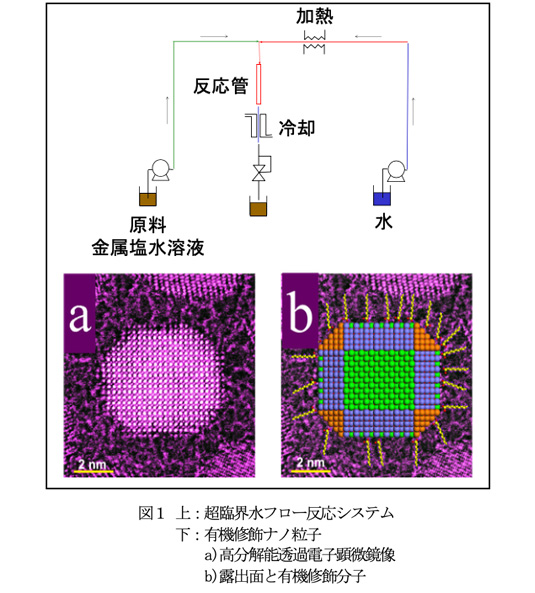 受賞者は、30年前、「超臨界水中での反応」、そしてそれによる「モノづくり」の研究に世界に先駆け取組んできた。超臨界場では、水と油、気体が均一に混合し、通常得られない特異な反応も生じる。反応を精密に制御できるフロー型反応システム(図1上)を独自に開発し、超臨界反応機構を解明するとともに、さらにそれを積極的に利用した新反応、廃棄物改質、新材料開発等、様々な応用展開を示し、世界の多くの研究者・技術者をこの新領域に集結させた。学術のみならず、その成果は世界初の超臨界ナノ粒子連続合成プロセス(無機反応)や超臨界ケミカルリサイクルプロセス(有機反応)の実用化にも繋がっている。