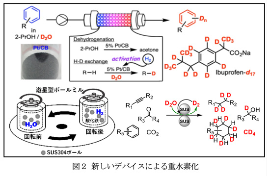 重水素標識化合物は、非標識体との質量数差を利用した質量分析法や核磁気共鳴による薬物動態研究・化学反応機構解明などに利用されている。重水素化による物質の安定性や機能性向上も重要で、光ファイバーポリマー、有機EL材料、中性子散乱同位体コントラストを利用した分子構造解析など広く有効性が認められている。医薬品代謝部位近傍を重水素化すると代謝遅延が期待されるため、薬効持続時間延長による投与量削減・副作用回避を目指す重水素化医薬品 (ヘビードラッグ)も注目されている。重水素化法としては、物質の炭素−水素 (H)結合を、炭素−重水素 (D)結合に直接変換するH−D交換反応が直接的であるが、高温・高圧条件を要するだけでなく、重水素源が合成コストに大きく反映するため、実用的価格での重水素化素材の提供が難しく、重水素化学発展の妨げであった。