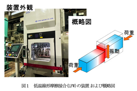 (2)低温線形摩擦接合技術(LFW)の確立:鉄鋼材料同士を直接、摩擦させる、回転ツールの不要なLFWを用いて、A1点以下の温度で接合する技術を確立した。圧力によって塑性変形、接合温度を精度よく制御する点が画期的であり、5年前に開発された技術にも拘わらず、複数の低温摩擦接合装置が販売されている。