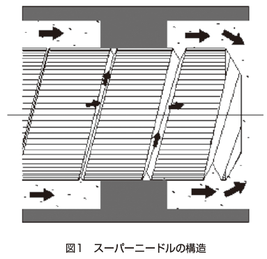 本開発によるスーパーニードルは、ハーゲン=ポアズイユの法則を巧妙に応用したもので、指数関数的に溝の深くなる多重らせん構造の三角溝を用いて、5桁以上の広範囲にわたる流量コントロールを可能にするもので、これまでのニードルバルブの常識を打ち破る新技術である。しかも、バルブ内部は耐腐食性に優れた部品のみを用い、一切の漏れを発生させないテフロンベローズシール構造を備えている。さらに、工場での自動制御を可能とする電動化も行う予定である。このように、本スーパーバルブは従来品とは異なる全く新しい多機能バルブである。